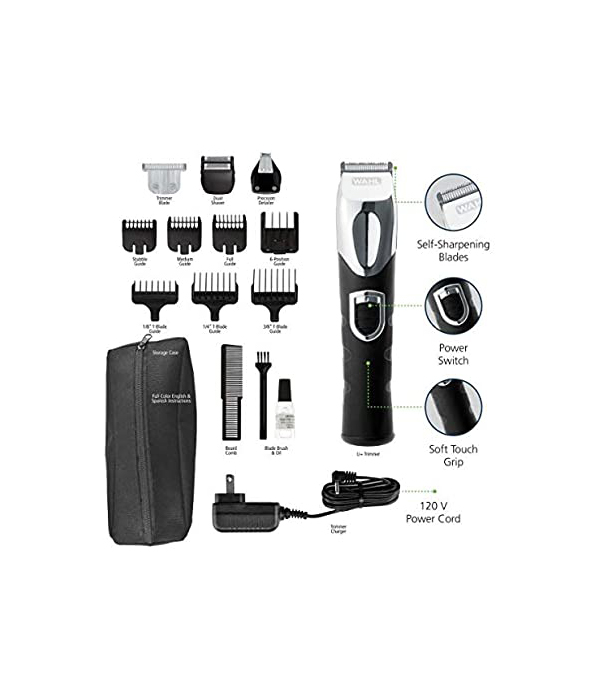 WAHL 1050-0410 LITHIUM ION TRIMMER يصل إلى 180 دقيقة وقت التشغيل مع 4 مشط تشذيب و 4 رؤوس تقطيع وفرشاة تنظيف وزيت التشحيم