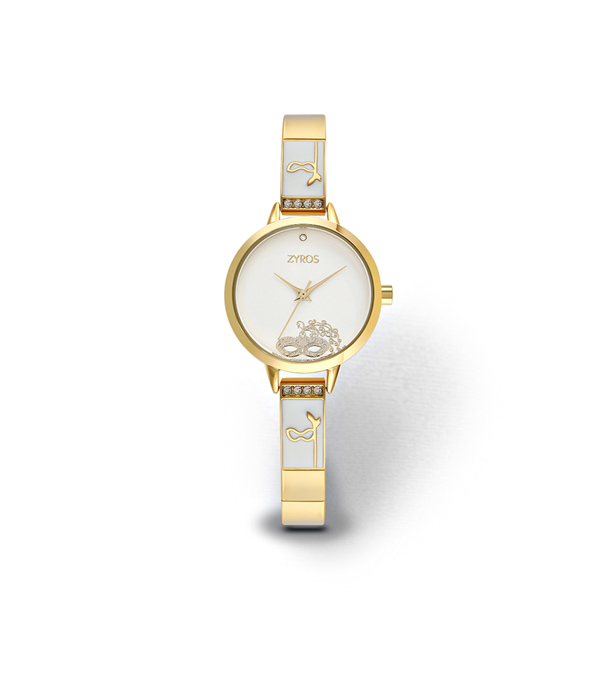 ساعة نسائية من ماركة زايروس بتصميم يلتقي فيه الإتقان بالفن. مصنوعة من المعدن المقاوم للصدأ ومقاومة للماء حتى عمق ٣ أمتار. لونها يجعل منها قطعة مثالية في المناسبات. السير مصنوع من المعدن مزين بالرسومات على جانبي المينا. هدية جميلة لصديقتك ذات الذوق الأنيق. السير المعدني والإطار وعقارب الساعة باللون الذهبي. المينا باللون الأبيض يشكل قطعة فنيّة بالرسومات التي وضعت لتزيد التصميم فخامة لتكون الساعة قطعة أساسية في زينتك.