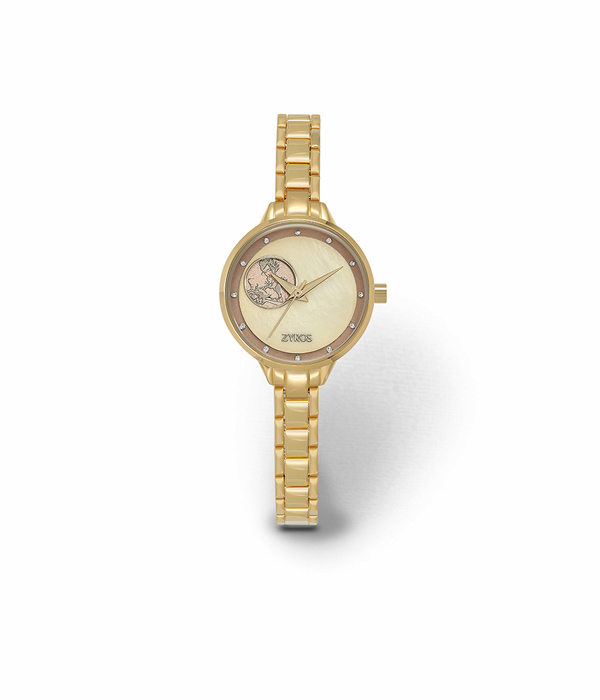 ساعة نسائية من ماركة زايروس بتصميم مبتكر. مصنوعة من المعدن المقاوم للصدأ ومقاومة للماء حتى عمق ٣ أمتار. ألوان الساعة وتصميمها مناسب للارتداء بشكل يومي. السير مصنوع من المعدن المصمم بشكل يشبه الأسورة. السير وعقارب الساعة والإطار باللون الذهبي بينما المينا مصنوع من الصدف ذو اللون الذهبي ليضفي لمسة أناقة على الساعة.
