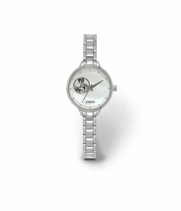 ساعة نسائية من ماركة زايروس بتصميم مبتكر. مصنوعة من المعدن المقاوم للصدأ ومقاومة للماء حتى عمق ٣ أمتار. ألوان الساعة وتصميمها مناسب للارتداء بشكل يومي. السير مصنوع من المعدن المصمم بشكل يشبه الأسورة. السير وعقارب الساعة والإطار باللون الفضي بينما المينا مصنوع من الصدف ذو اللون الأبيض ليضفي لمسة أناقة على الساعة.