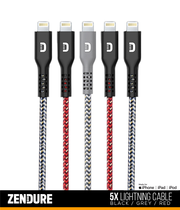 بكج 5 كيابل ايفون من زندور 2 اسود + 2 احمر + 1 رمادي