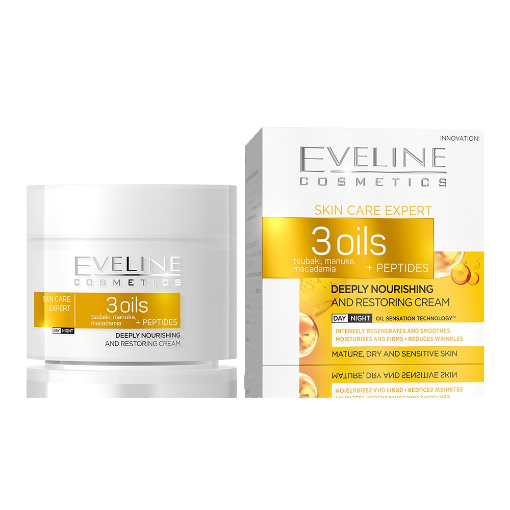 تم تطوير كريم مغذي وتجديد عميق من قبل علماء من مختبر مستحضرات التجميل Eveline بهدف الحاجة إلى تغذية مركزة وإصلاح العناية اليومية لجميع أنواع البشرة الناضجة ، بما في ذلك البشرة الجافة والحساسة. تركيبة فريدة تجمع بين ثراء 3 زيوت وقوة تقنية الببتيد المتقدمة ، مما يوفر تأثيرات تجديد مذهلة ، يمكن مقارنتها بنتائج العلاجات الجلدية.