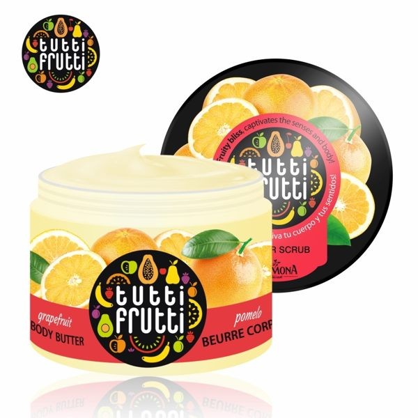 زبدة الجسم توتي فروتي بالجريب فروت برائحة منعشة من الجريب فروت ، تغذي وتجدد وتمنح بشرتك رطوبة طويلة الأمد.